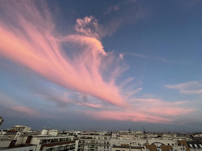 A giant pink cloud on over the sky of Paris. Really wonderful scene strikes my heart.